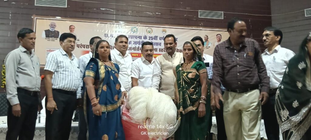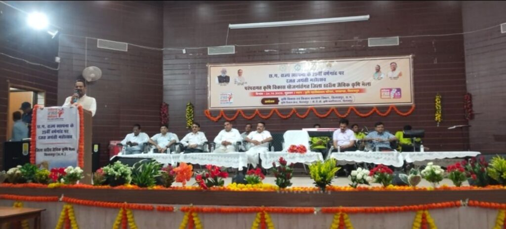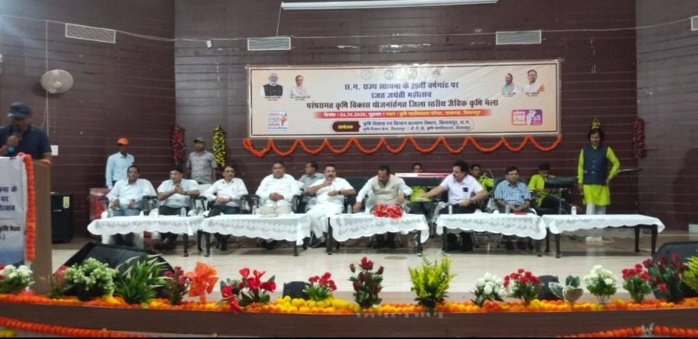 हरिओम श्रीवास कृषि विकास एवं किसान कल्याण विभाग बिलासपुर, कृषि विज्ञान केन्द्र, बिलासपुर एवं कृषि महाविद्यालय, बिलासपुर के संयुक्त तत्वाधान में कृषि महाविद्यालय, बिलासपुर के सभागार में छत्तीसगढ़ राज्य के 25वीं वर्षगांठ पर एक दिवसीय रजत जयंती महोत्सव एवं परंपरागत कृषि विकास योजना अंतर्गत जिला स्तरीय जैविक कृषि मेला का आयोजन किया गया। इस अवसर पर श्री राजेश सूर्यवंशी, अध्यक्ष जिला पंचायत, बिलासपुर मुख्य अतिथि के रूप में विद्यमान रहे एवं उन्होने अपने उद्बोधन में जैविक खेती, दलहन, तिलहन व सब्जी की खेती को वैज्ञानिक तरीके से करने हेतु प्रोत्साहित किया। उप संचालक कृषि, श्री पी.डी. हथेस्वर ने कार्यक्रम की रूपरेखा तथा कृषि से संबंधित विभिन्न योजनाओं की उपलब्धि की जानकारी दी। विघायक प्रतिनिधि बेलतरा, श्री उमेश गौराहा ने सभी कृषकों को उन्नत तकनीक से खेती करने व पानी बचाने का आग्रह किया।